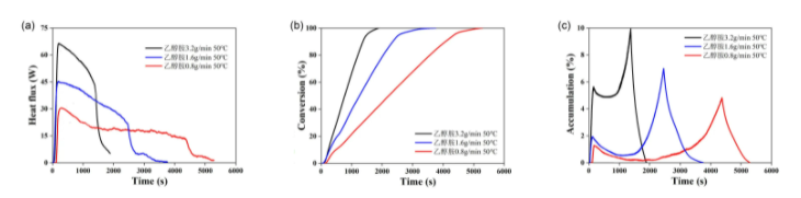 我們將通過紅外與在線量熱分別計算得到的轉(zhuǎn)化率曲線進(jìn)行對比,可以發(fā)現(xiàn)兩者非常接近。可以認(rèn)為前者代表了反應(yīng)物轉(zhuǎn)化率變化,后者代表了反應(yīng)完成度變化,均可以體現(xiàn)反應(yīng)的動力學(xué)特征。理論上,化學(xué)反應(yīng)轉(zhuǎn)化率越高,兩者的差異越小。