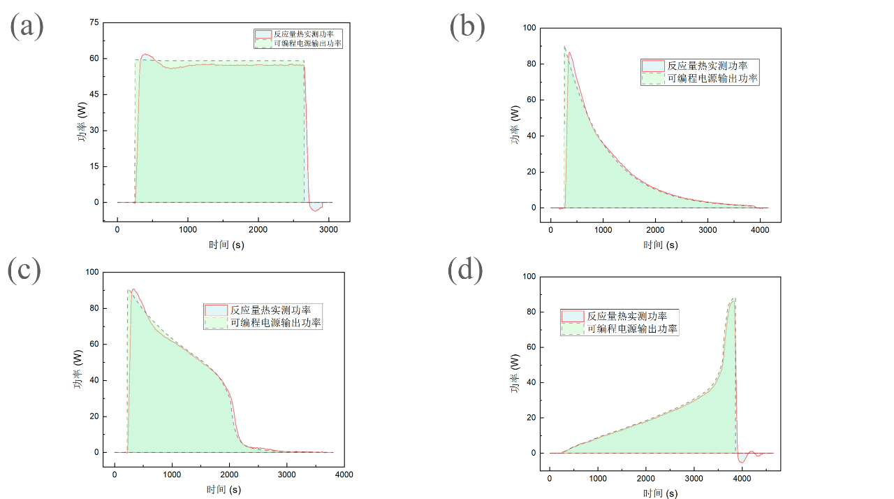 如圖4,進一步將電源實際輸出功率與RC HP-1000A自動反應量熱儀測量結(jié)果進行對比,能夠發(fā)現(xiàn)兩條功率曲線幾乎完全重合。量熱儀測定的熱流數(shù)據(jù)僅在放熱初期功率階躍變化的時刻存在一定的滯后現(xiàn)象。熱滯后與量熱系統(tǒng)固有的熱特性(系統(tǒng)熱容、樣品/夾套熱阻等)有關(guān),無法完全消除,可采用一定的算法進行修正。