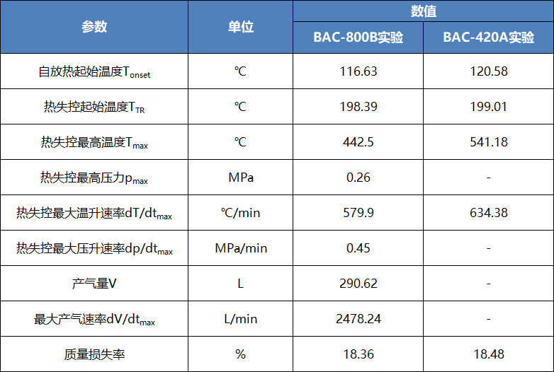 相較于之前的絕熱量熱儀,密閉型電池絕熱量熱儀可獲得更多的絕熱熱失控?cái)?shù)據(jù),同時(shí)保證了絕熱性能的準(zhǔn)確可靠性,即獲得準(zhǔn)確可靠的溫度數(shù)據(jù)。另外,同一個(gè)電池的熱失控?cái)?shù)據(jù)在兩種不同儀器上的復(fù)現(xiàn)性也是許多人關(guān)注的重點(diǎn)。因此,本次實(shí)驗(yàn)選用了兩個(gè)500Ah+磷酸鐵鋰電池分別在BAC-420A及BAC-800B開展測試。